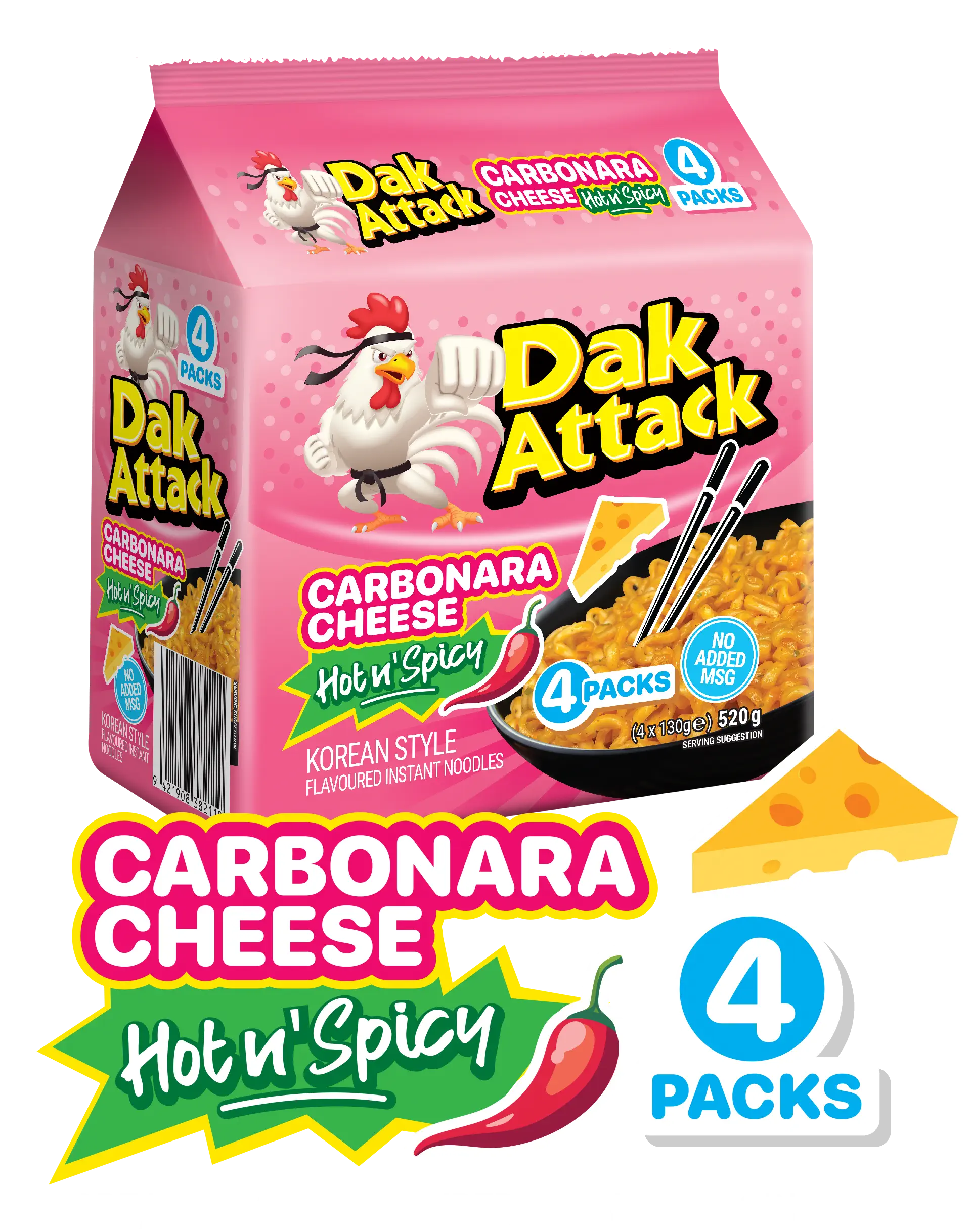 Noodles (83.54%) [Wheat flour, Palm Oil RSPO [Includes Antioxidant (321)], Tapioca Starch, Salt, Thickener (466), Humectant (450(i), 450(iii), 451(i), 452(i)), Acidity Regulator (500)], Seasoning Powder (14.15%) {Milk powder, Sugar, Chilli powder, Black pepper powder, Flavours (Cheese, Milk), Salt, Onion powder, Garlic powder, Soy Sauce Powder (Soybean, Wheat flour, Salt), Creamer [Palm oil, Glucose syrup, Sodium caseinate (from Milk), Emulsifiers (340(ii), 471)], Paprika powder, Tomato powder, Flavour enhancers (Disodium 5' inosinate, Disodium 5' guanylate), Maltodextrin, Chilli extract, Thickener (421), Dried parsley, Colour (160c), Anti-caking agent (551), Acidity regulator (330)}, Seasoning oil (2.31%) [Palm oil RSPO (Includes Antioxidant (321), Fried garlic oil, Chilli pieces, Colour (160c)].